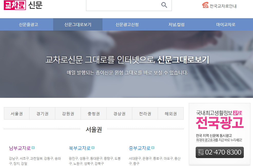 그러면 전국지도가 보이고 그아래 교차로 신문이 보입니다. 여기서 바로 해당되는 지역으로 클릭하셔도 되지만 전국지도 아래 교차로 신문 글자가 보이는데 클릭해주세요.