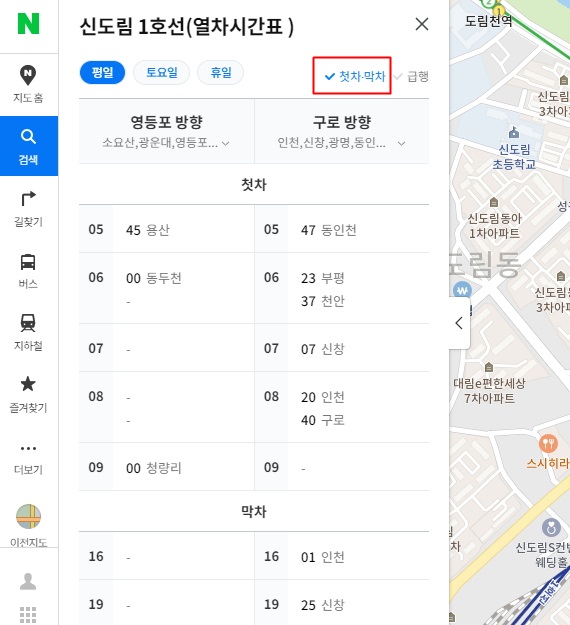그리고 맨위쪽 오른쪽을 살펴보면 첫차, 막차 시간도 제공해주는데요. 첫차, 막차 글자를 클릭해보겠습니다. 1호선 급행 시간으로 아래와 같이 시간이 친절하게 잘 제공이 되어있습니다.