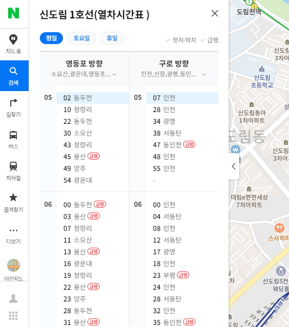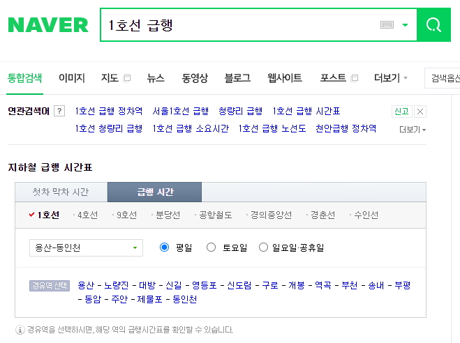 모바일에서도 네이버에 1호선급행이라고 검색하면 아래와 같이 보입니다.
