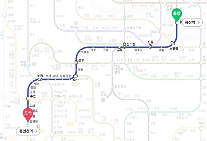 용산-동인천행은 용산- 노량진- 대방- 신길- 영등포- 신도림- 구로- 개봉- 역곡- 부천- 송내- 부평- 동암- 주안- 제물포- 동인천 이 있고, 용산-동인천(특급)행으로는 용산- 노량진- 신도림- 구로- 부천- 송내- 부평- 주안- 동인천으로 있습니다.