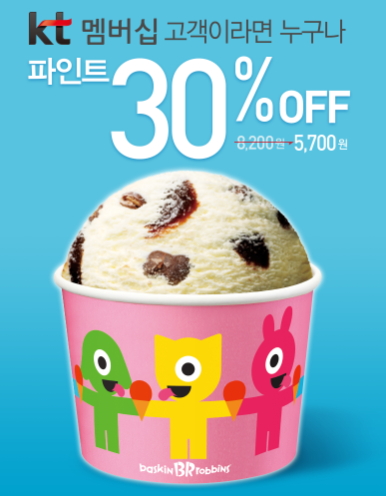 그리고 배스킨라빈스 통신사 할인으로 kt 멤버십이신 분들은 올해 파인트 구매 시 30% 할인 혜택이 있는데요. 배스킨라빈스파인트가격은 8,200원인데요 kt 멤버십으로 할인 받으시면 5,700원에 구입하여 맛있게 먹을수 있겠습니다.