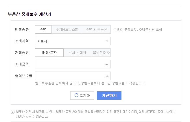 부동산 거래 형태가 어떤 것인지 선택하시고 지역이 어디인지도 선택하신 다음 거래금액 입력하시고 적용되는 부동산 중개수수료도 입력하시면 잘 나옵니다. 요즘은 정말 편리한 시대에 사는 거 같아요. 30~40년 전만 해도 그러니까 1990년대만 해도 정보를 알 수 없어서 중개인이 부르는 대로 줬거든요. 마지막으로 부동산 계약할 때 계약하는 분은 부동산중개료 계산하는 방법에 대해 정확하게 설명 들을 권리가 있으며 계산 방법에 따라 내실 권리가 있습니다.
