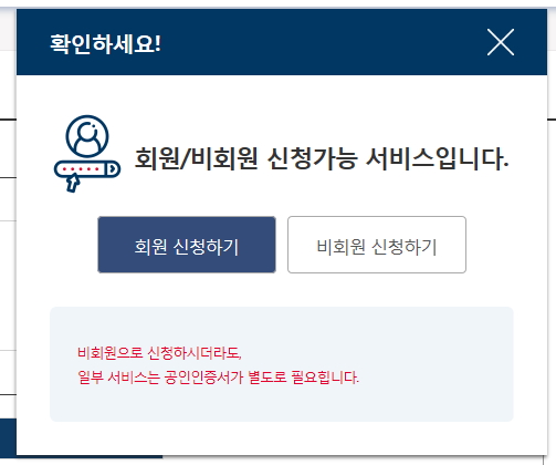그러면 아래 비회원 신청도 일부 공인인증서가 필요할 수도 있다는 문구가 보입니다.