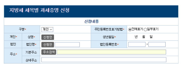 지방세 항목별 과세 증명은 자동차세가 납부되었다는 증빙서류로 과세 대상 주소 선택 항복에는 차량 등록 위치의 주소를 입력하시고, 사용 목적에는 차량 매매라고 적으시고 , 굳이 영업장은 작성하지 않으셔도 됩니다. 자동차세 납부영수증 수령방법에서는 온라인 발급 1부 발행이라 해놓고 신청하기를 눌러주시면 됩니다.
