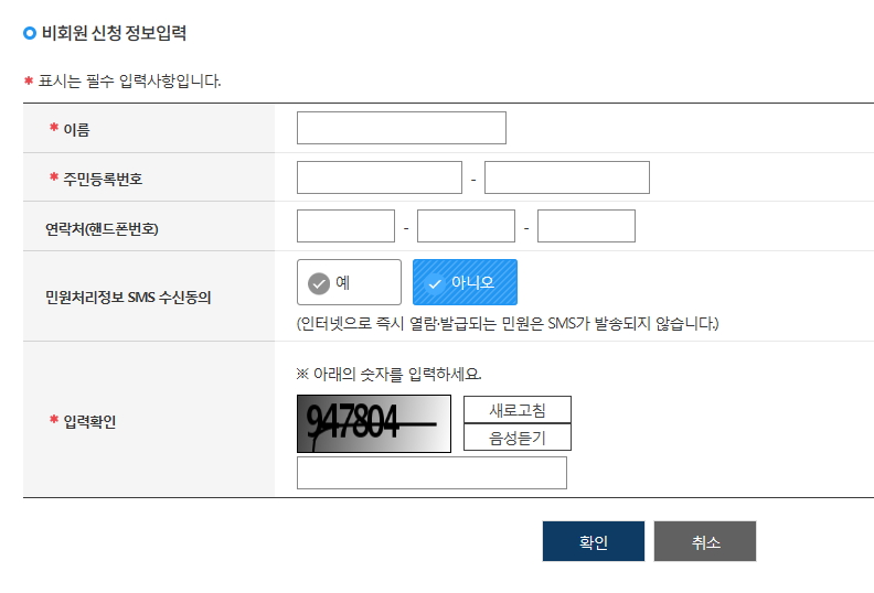 비회원 신청 정보도 입력하고 이름과 주민번호 및 민원처리 정보를 문자로 수신할 것인지도 모두 체크하고 시도해봅니다.