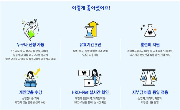 이로 인해 직장인은 직장에서 필요한 기능을 습득하기 위해서 필요한 온라인 코스와 오프라인 코스를 수강할 수 있고, 구직자도 취업에 필요한 자격을 취득할 수 있습니다. 지원한도액은 1인당 300만~500만 원으로 훈련비의 45~85%가 지급되고 있습니다.
