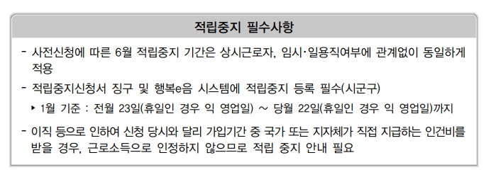 만약에 소득이 발생이 어렵다면 적립중지를 신청할 수 있는데요. 단 실직이나 본인 및 부양가족의 질병 또는 사고 등 부득이한 사유가 있을 경우에만 가능하며 3년 중에 최대 6개월 간만 적립 중지가 가능합니다. 당연히 중지기간 중에는 공제금 및 장려금은 지원되지 않습니다.