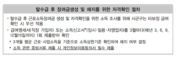 근로소득장려금은 3년 이내 생계급여 수급자에서 벗어나는 경우에 한하여 적립금을 지급하는데요. 대신 가입기간 동안 근로사업소득이 1인 가구 기준으로 중위소득 20% 이상 유지는 하였으나, 만기 후에 3개월 유예기간 동안 탈수급하지 못한 경우에만 1회 한해서는 지급이 가능합니다.