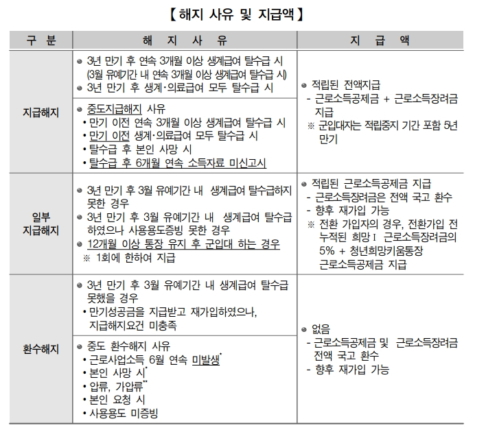 또 혹시라도 가입기간 중 근로소득이 연속 6회 이상 소득하한선 미달이 되면 중도해지가 되어 지원금 지급이 불가능해집니다.