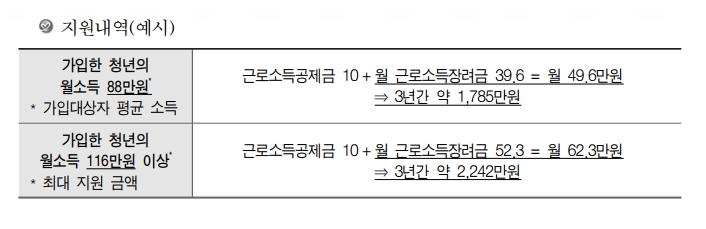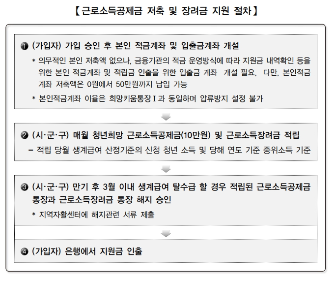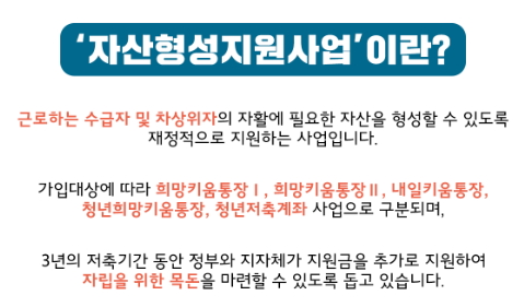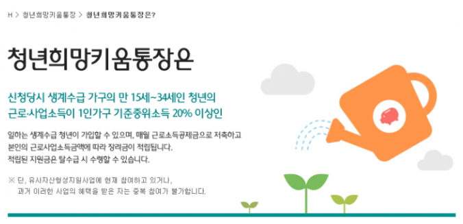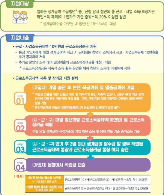 이 프로그램은 특히 일하는 청년을 대상으로 하기 때문에 신청이 가능하며, 총 근로소득이 가구당 중위소득의 20% 이상인 일하는 생계 수급 청년이 가입할 수 있는 제도를 말합니다.