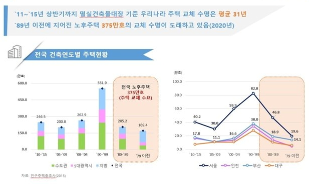 초기 아파트들은 층수가 낮아서 리모델링이 아닌 재건축을 통해서 층수를 높이 세워 세대수를 늘려 수억 원의 차익을 남길 수가 있었는데요. 건축물이 30년이 지나도 이상이 없는 경우라면 재건축 허가가 나지 않기 때문에 건물들을 일부러 방치하고 훼손되는 경우가 종종 나타났습니다.