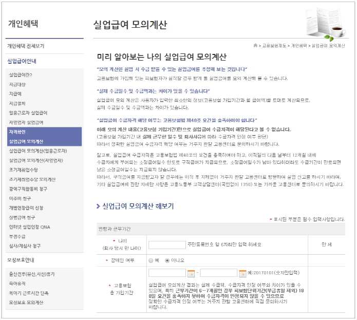 실업급여신청 기간은 퇴직 다음날로부터 12개월 이내로 1년이 넘으면 신청이 불가하니 꼭 기억해두시기 바랍니다. 또 수령 가능한 기간은 최대 240일까지 받을 수 있으며 나이와 조건에 따라 조금씩 다르게 적용되기 때문에 정확한 내용은 고용보험 홈페이지를 통해 알아보시기 바랍니다. 실업급여 금액은 고용보험 홈페이지에서 모의계산을 통해 비교적 정확하게 알 수가 있습니다.