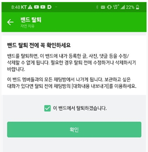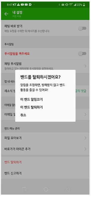 넘어오니 이밴드 탈퇴하기가 바로 뜨네요. 눌러주세요.