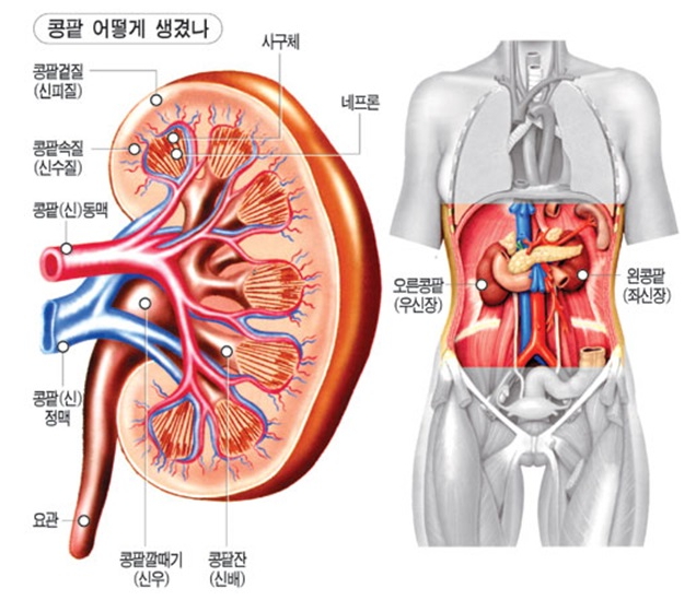 신장은 콩팥이라고 하며 우리 몸에서 단위 면적당 혈액이 가장 많이 공급되는 장기로 인체의 정수기라고 부를 만큼